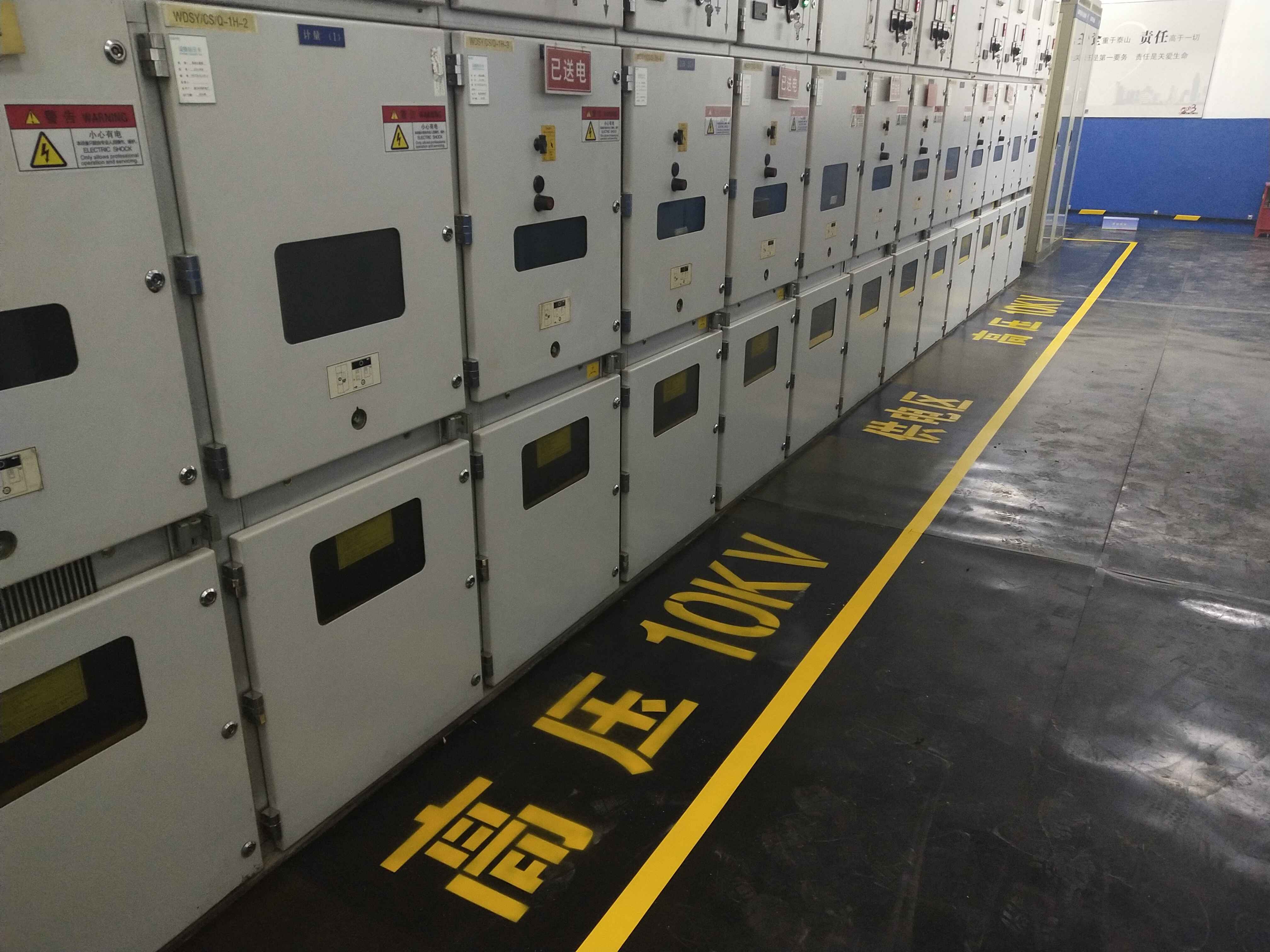 4、地面全部鋪設(shè)絕緣膠墊可以用黃色絕緣膠帶(絕緣漆)規(guī)劃出工作區(qū)域,并在內(nèi)部加上相關(guān)字體,如高壓**千伏等,看起來大氣非凡,如下圖: